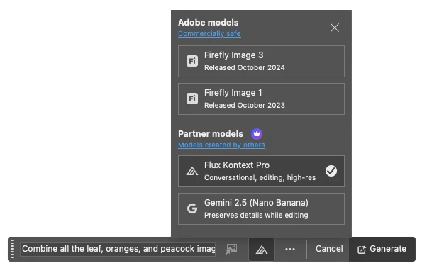 Gemini 2.5(Nano Banana) 및 Flux Kontext Pro 모델은 Adobe에서 제작하지 않았습니다. 두 모델 중 어느 것이 프로젝트에 적합한지 판단하는 것은 사용자의 책임입니다.