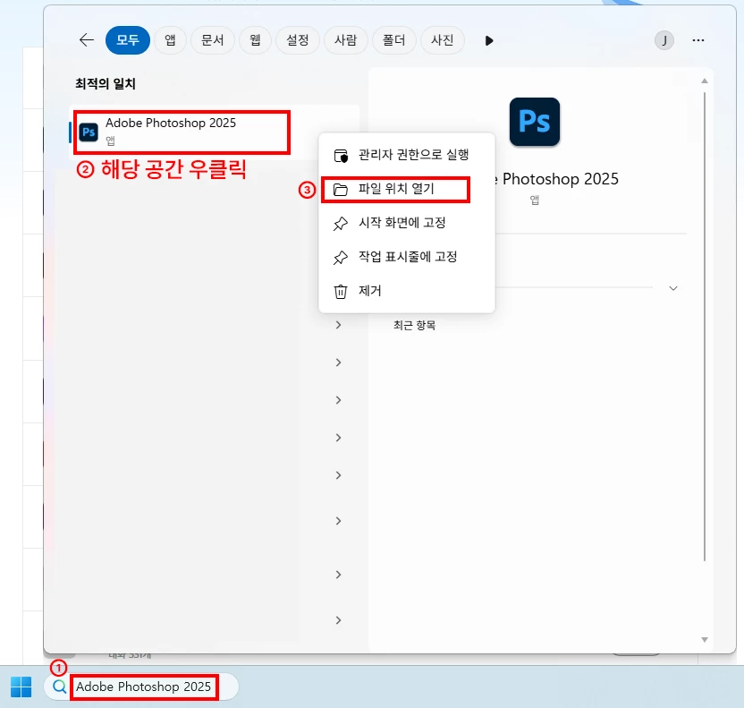 2. 사용자 분의 PC에 설치된 포토샵이 확인된다면, 우클릭하여 [ 파일 위치 열기 ] 를 클릭합니다.