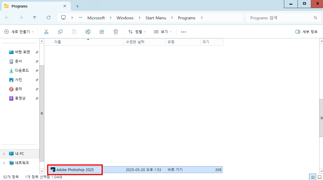 3. [ Programs ] 폴더가 열렸다면, 그 안에 포토샵 바로가기가 확인될텐데요. 이 바로가기를 클릭하고 Ctrl + C, 바탕화면의 빈 공간을 클릭해서 Ctrl + V를 진행하면 바탕화면에 바로가기를 추가할 수 있습니다.