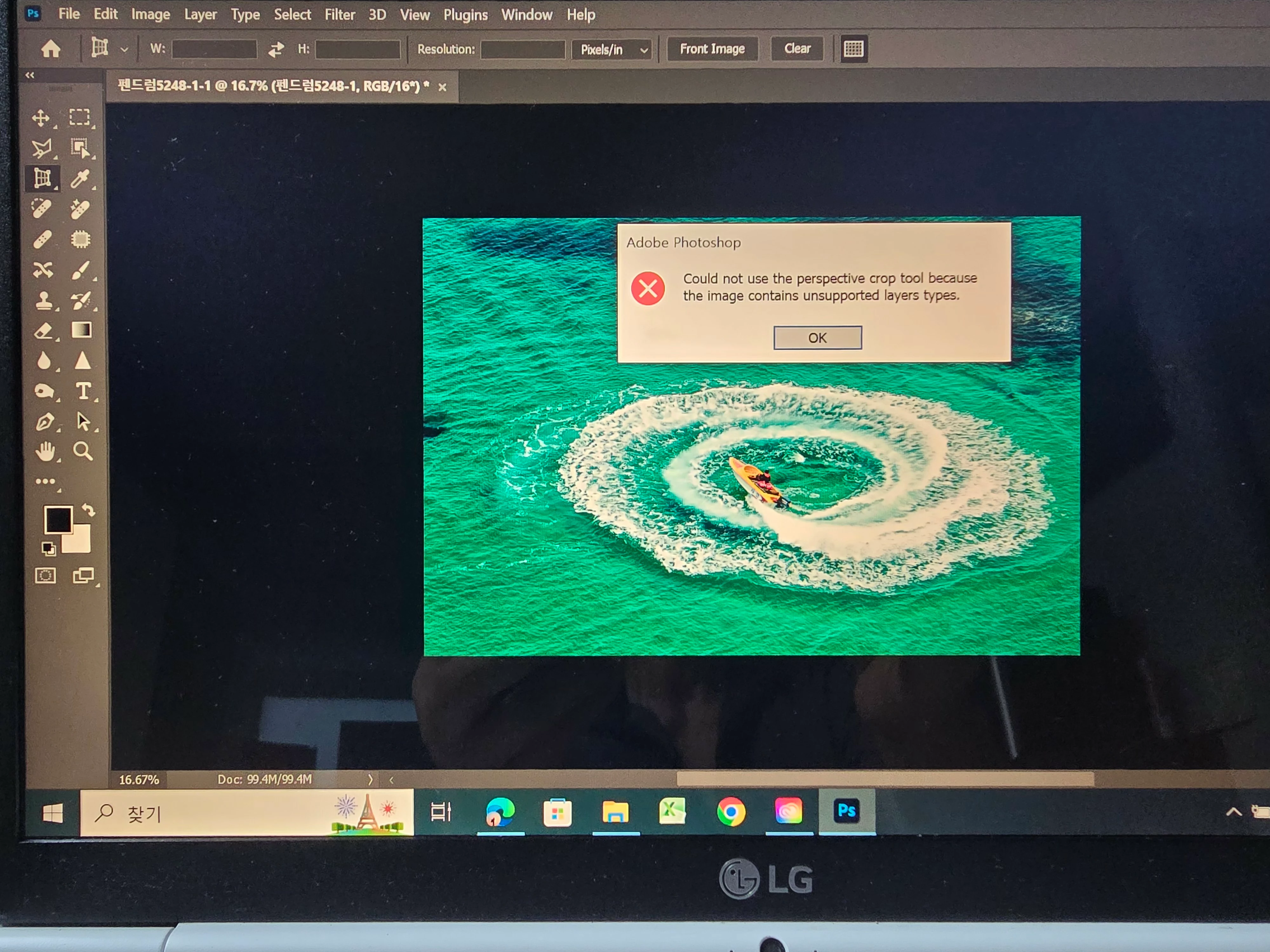편집하고자 하는 레이어가 스마트 오브젝트일 경우, Prespective crop tool 사용이 되지 않을 수 있습니다.