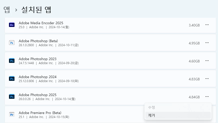 이후에도 설치가 되지않으신다면 일단 PC의 앱설치 메뉴에서 포토샵이 아직 존재하는지 확인후