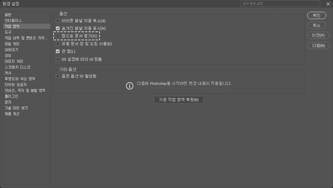 원래쓰던 노트북은 계단식 배열로 정렬이 됐는데 다른 컴퓨터에서 오늘 다시 깔아서 사용 할 때 보니까 파일 열때 겹겹이 쌓여서 열리더라구요 ㅠㅠ설정하는 방법이 있을까요?
