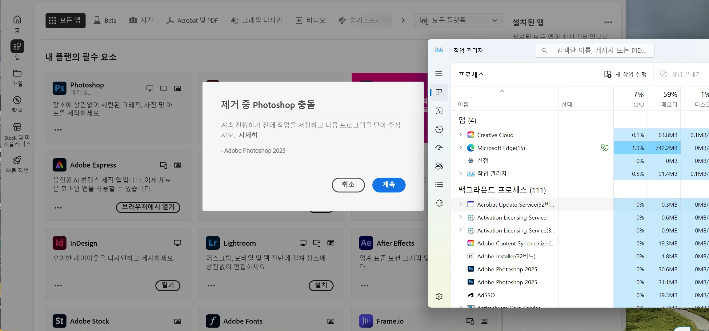 또한 [열기] 이후 프로그램이 실행되지 않아서 제거를 누르면 포토샵 충돌이 일어났다고 포토샵을 끄고 다시 제거를 진행하라고 하는데 작업관리자에 들어가도 포토샵이 실행 중이라는 창은 뜨지 않습니다.