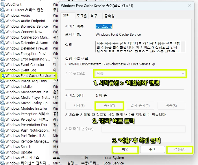 Services.msc를 실행하여 Windows 글꼴 캐시 서비스 (Windosw Font Cache Service)를 복구 합니다.
