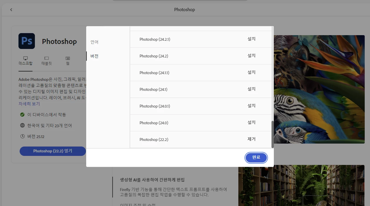 다만 포토샵의 경우 예외적으로 22.2버전을 추가지원하고 있습니다.
