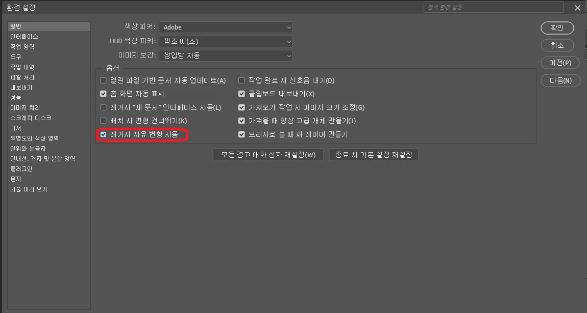 (1) 편집 > 도구 > 환경설정 > 일반 > 레거시 자유 변형 사용 옵션 체크