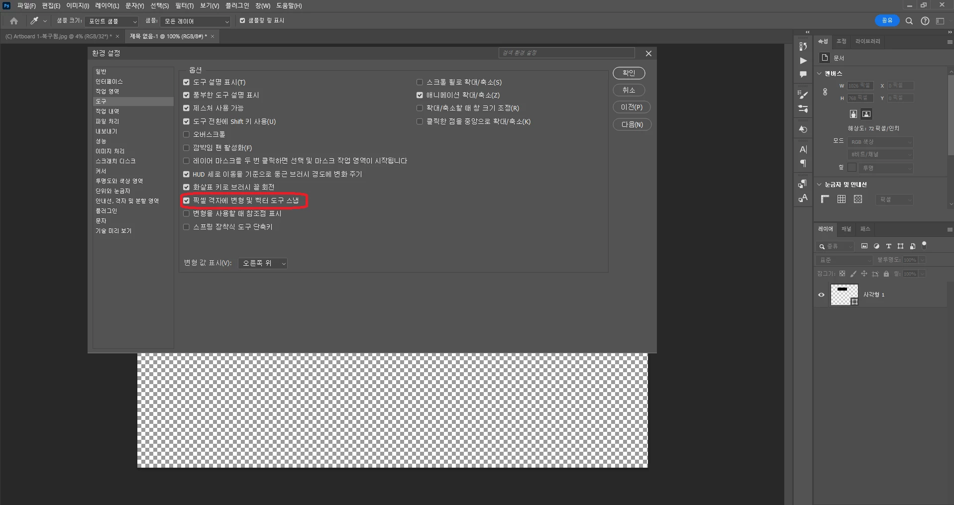 (2) 편집 > 도구 > 환경설정 > 도구 > 픽셀 격자에 변형 및 벡터 도구 스냅에 체크 해주세요