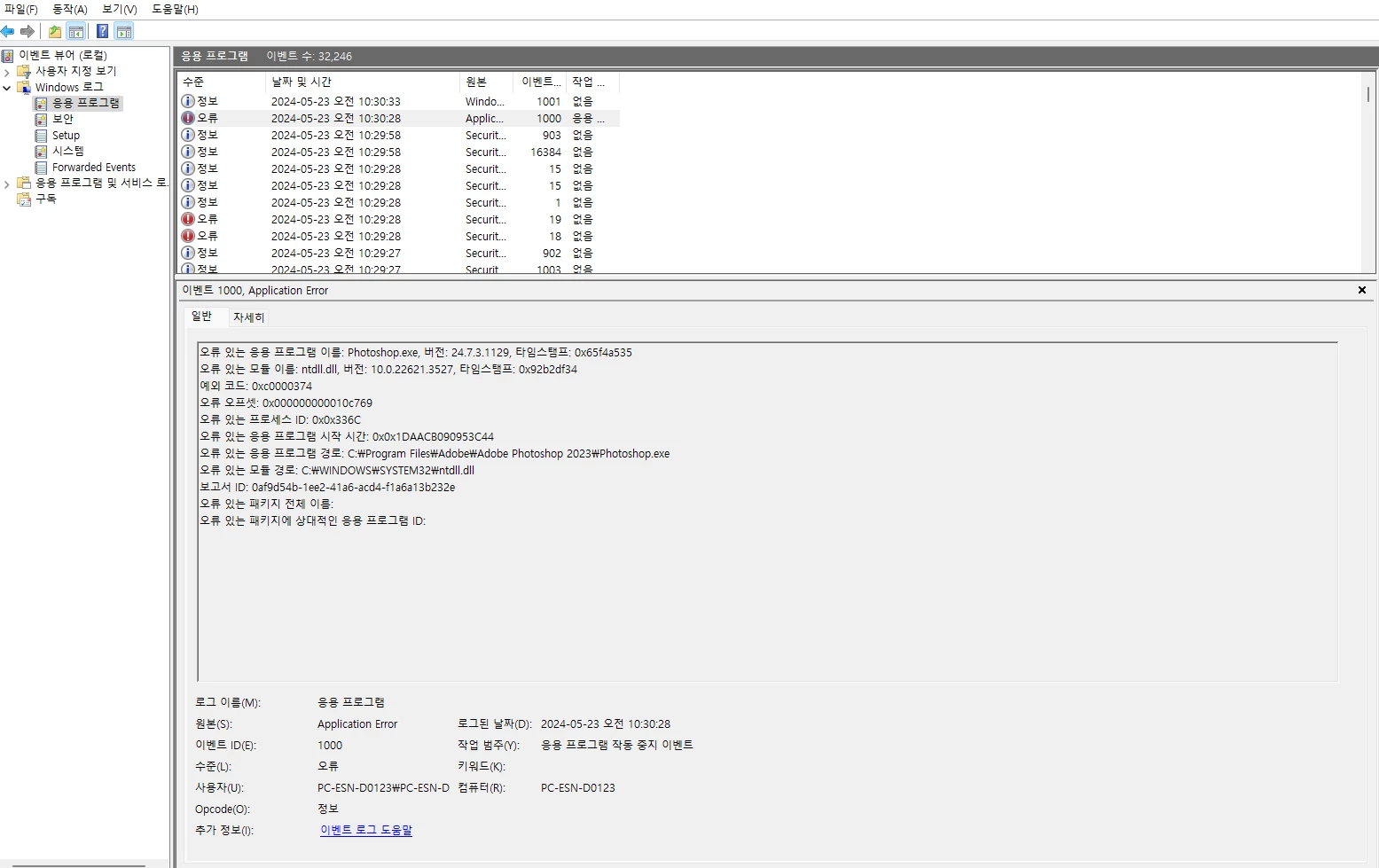 윈도우 이벤트뷰어에 노출되는 오류메시지도 첨부합니다.