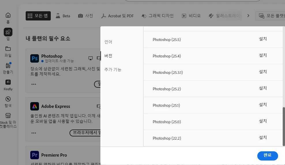위의 제안으로 해결되지 않는다면 환경설정/설정 폴더를 백업한 다음 Photoshop의 이전 버전(2024년도 버전 > 25.x 버전 )으로 롤백 (방법은 아래 문서와 이미지를 참조해주세요)