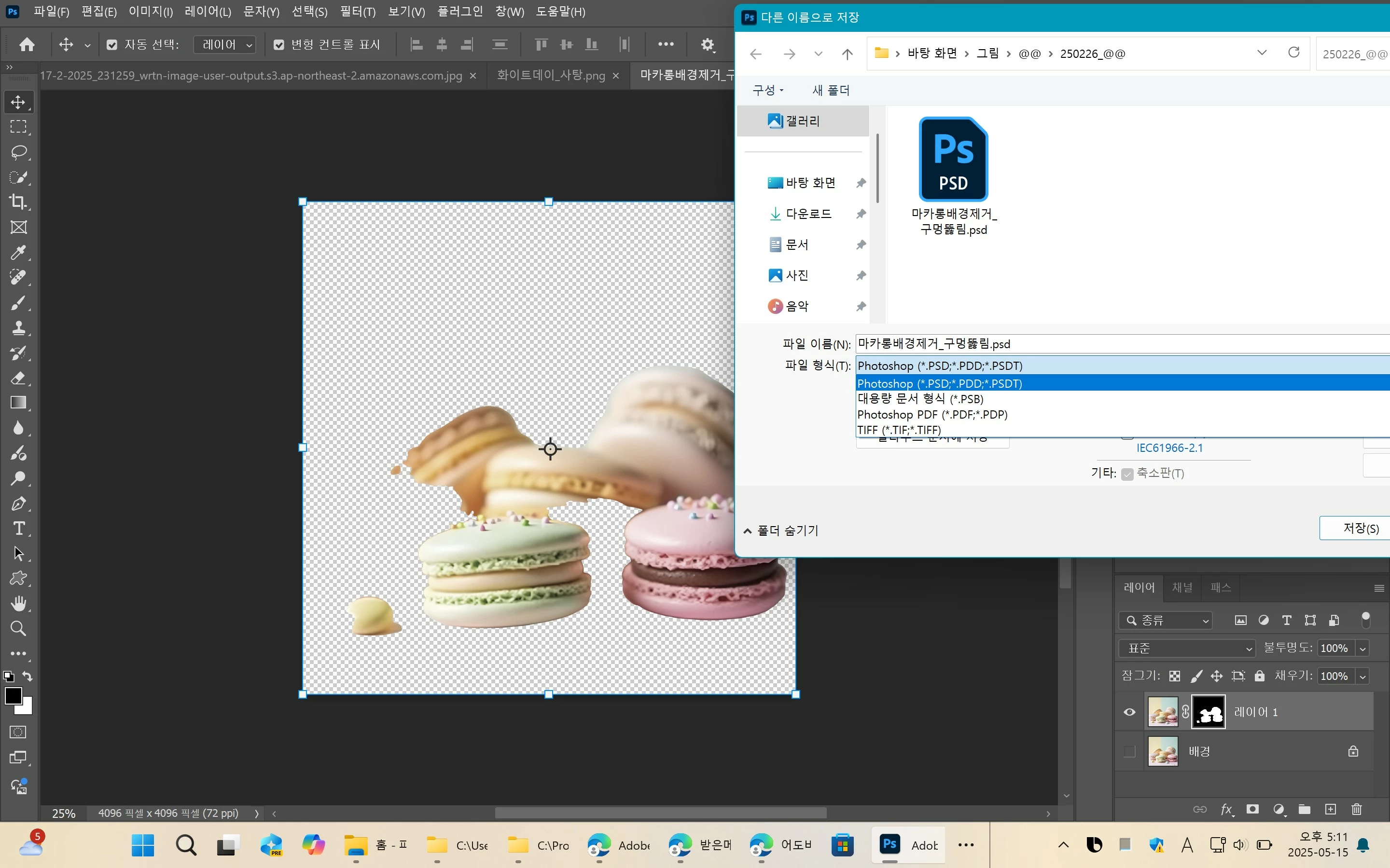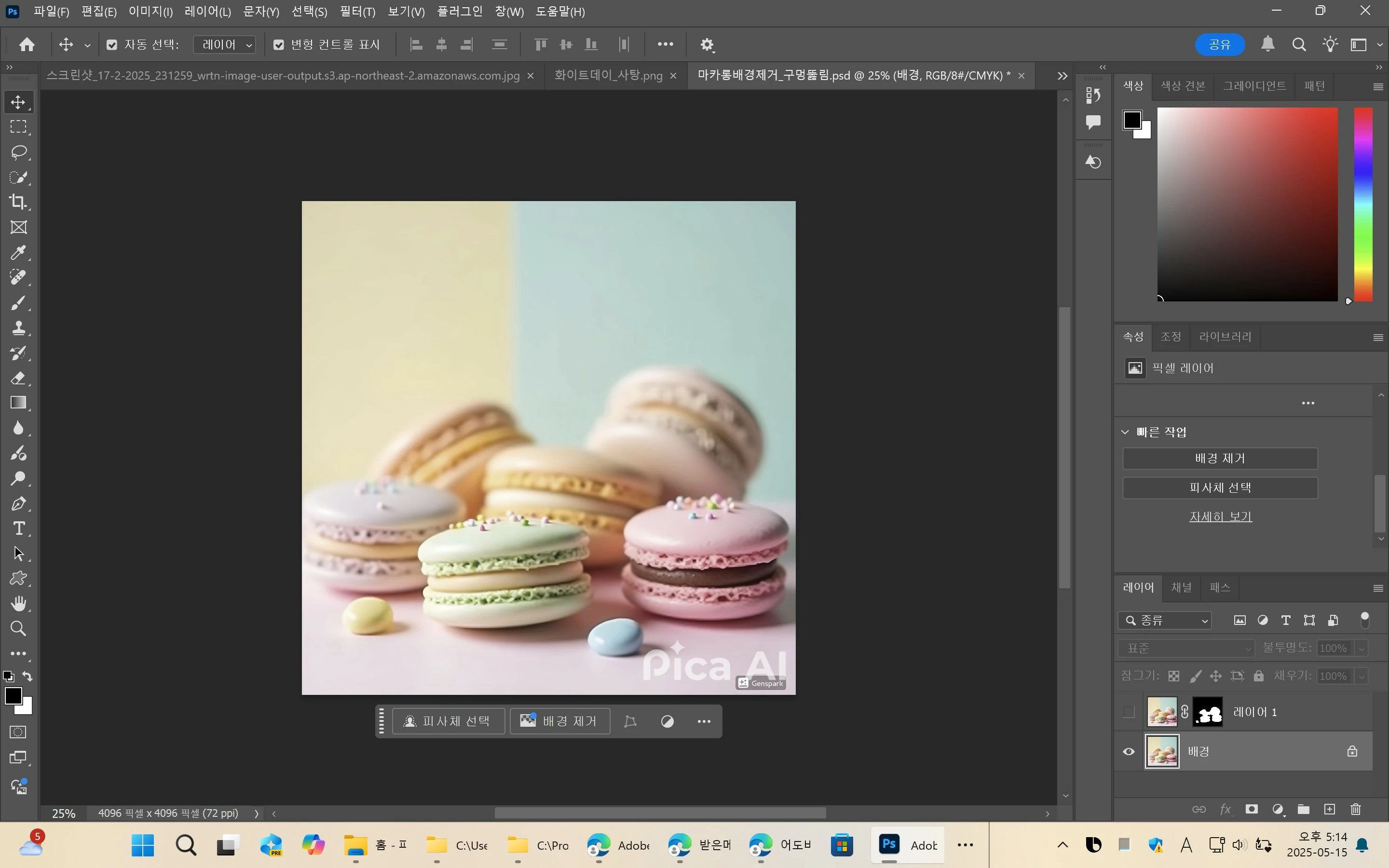 이 중 [ 편집 ] 메뉴에서 [ 환경 설정 ] 선택 후, [ 이미지 처리 ] 항목을 클릭하면 [ 피사체 선택 및 배경 제거 ] / [ 선택 처리 ] / [ 제거 도구 처리 ] / [ 세부 사항 항상 처리 중 ] 항목을 볼 수 있습니다!