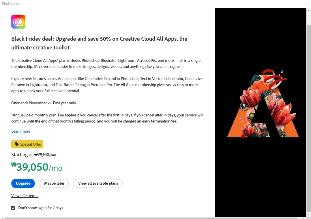 포토샵 실행할 때마다 매번 black friday del 관련 팝업창이 뜹니다.