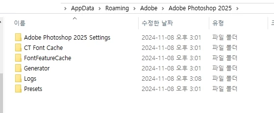 포토샵 버전 셋팅 폴더에는 아무것도 없습니다.