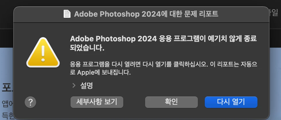 포토샵 설치 후에 실행하려니까 계속 이러면서 안 켜져요 다시 열기 해도 똑같고 삭제 후에 다시 깔아보기도고 하고 재부팅도 해보고 아예 로그아웃했다가 다시 깔아보기도 했는데 계속 이러는 건 뭐가 문젠가요