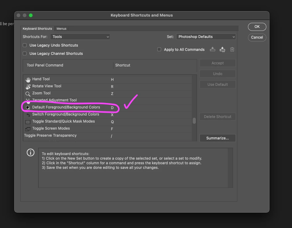 Default Foreground/Background Colors는 전경/배경색을 디폴트값(전경 검정, 배경 흰색)으로 되돌리는 단축키(D)입니다.