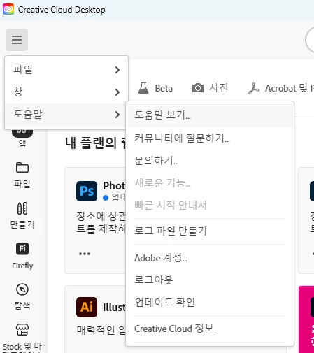 해당 클라우드 업데이트가 필요해 보이는데 일단 윈도우라면 좌상단의 가로줄 3줄 아이콘을 누르고 도움말 > 업데이트 확인을 눌러서 크리에이티브 클라우드 업데이트를 진행하고 나서 기타버전이 확인 되시는지 확인해 보시고