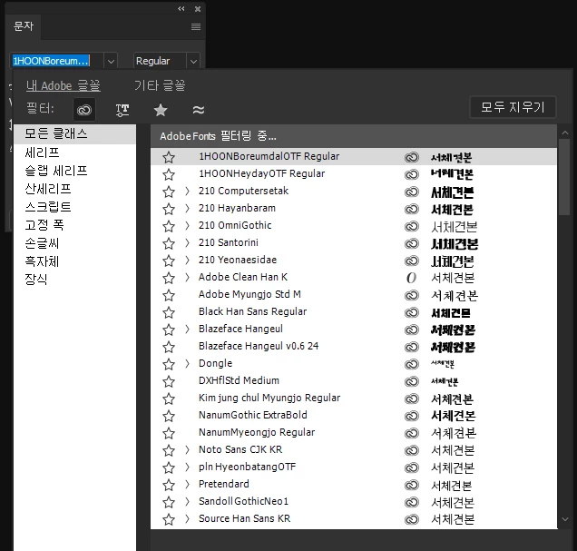 폰트패널에서 필터 선택창이 최신버전 포토샵의