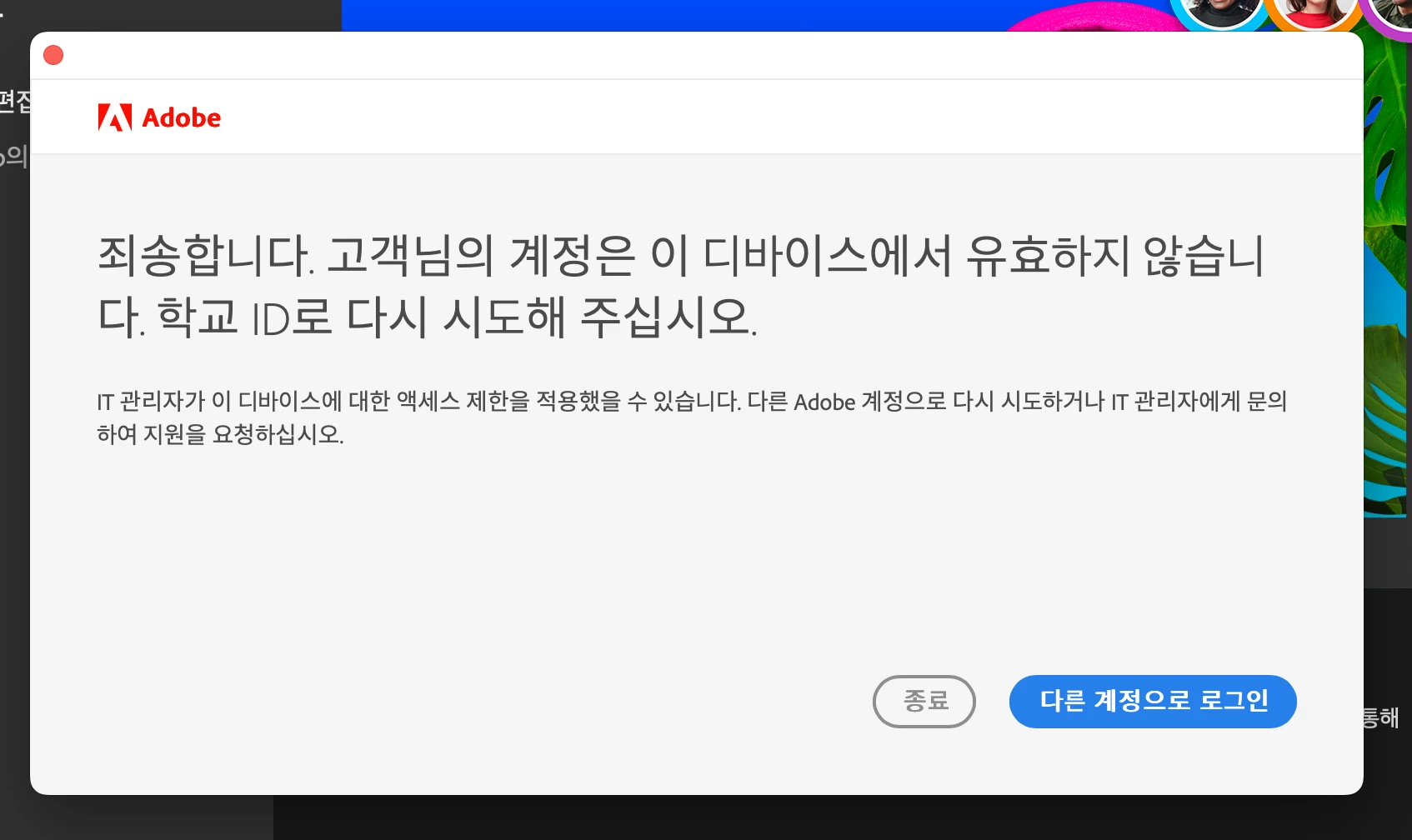 Creative Cloud에 개인 계정으로 로그인 후 포토샵에 로그인하면 아래와 같은 창이 나타나며 포토샵이 꺼집니다.