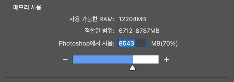 Photoshop > 환경설정 > 성능 에서 메모리 사용의 + 버튼을 눌러 포토샵에서 사용하는 메모리를 늘려 보시고 다시 시도해 보세요.