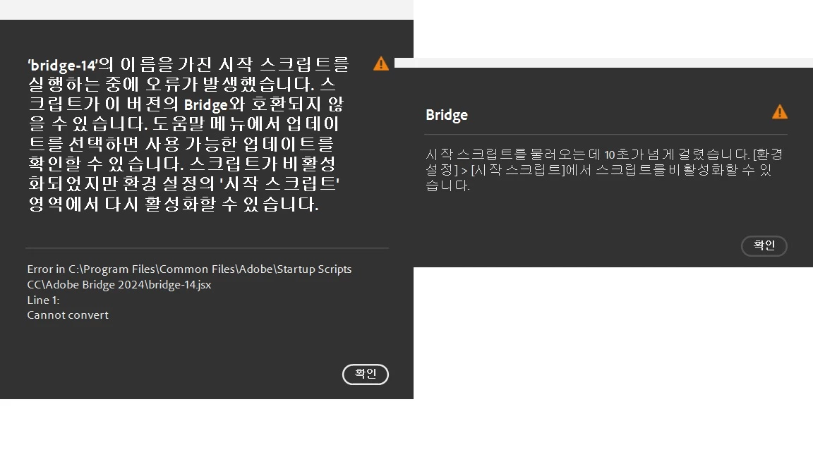 오류메시지가 "bridge-14"의 이름을 가진 시작스트립트를 실행하는 중에 오류가 발생했습니다. 스크립트가 이전버젼의 bridge와 호환되지 않을 수 있습니다. 도움말 메뉴에서 업데이트를 확인할 수 있습니다. 스크립트가 비활성화되었지만 환경설정의 시작스므립트 영역에서 다시 활성화 할 수 있습니다." 라고 뜹니다.