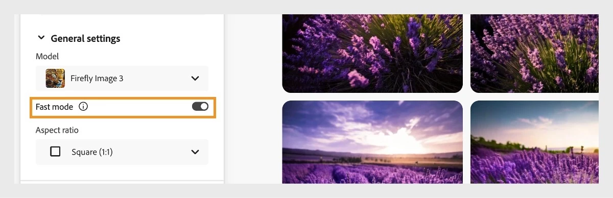 - 일반 설정 섹션 에서 모델 드롭다운 메뉴를 사용하여 Firefly Image 3를 선택 하고,