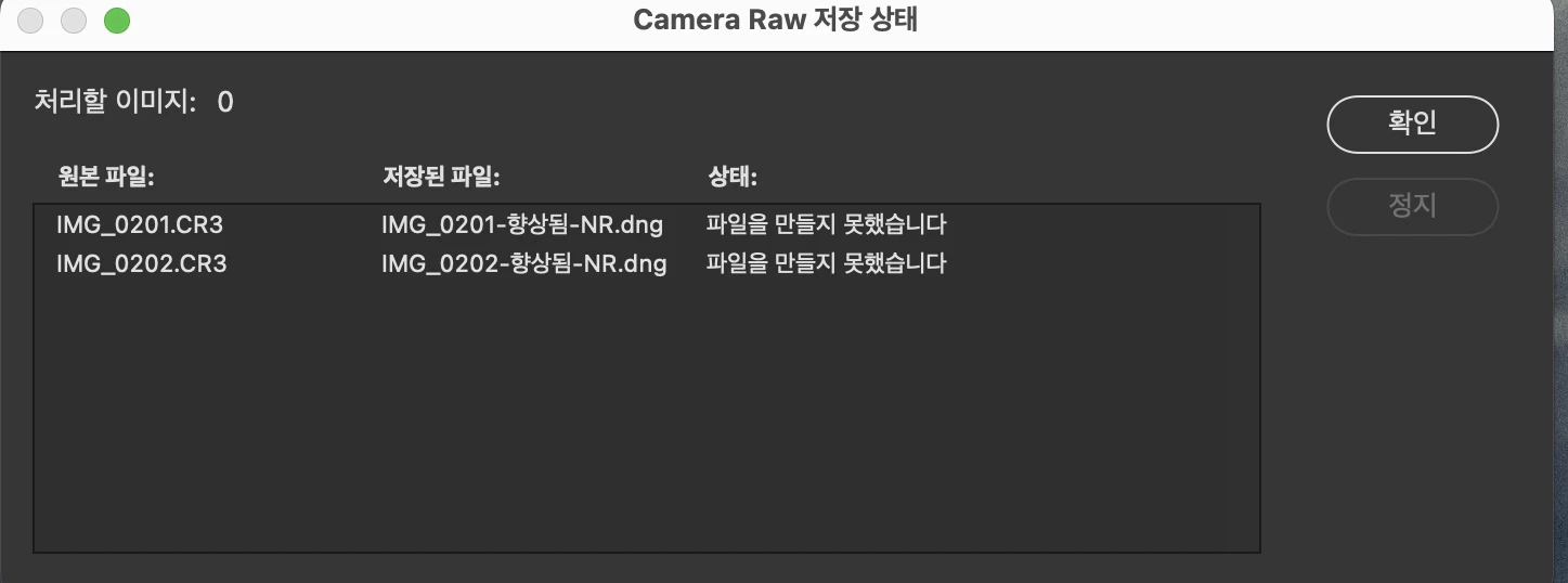 AI 노이즈 감소기능 실행시 dng "파일을 만들지 못했습니다." 메시지가 계속 실행됩니다. macOS Ve