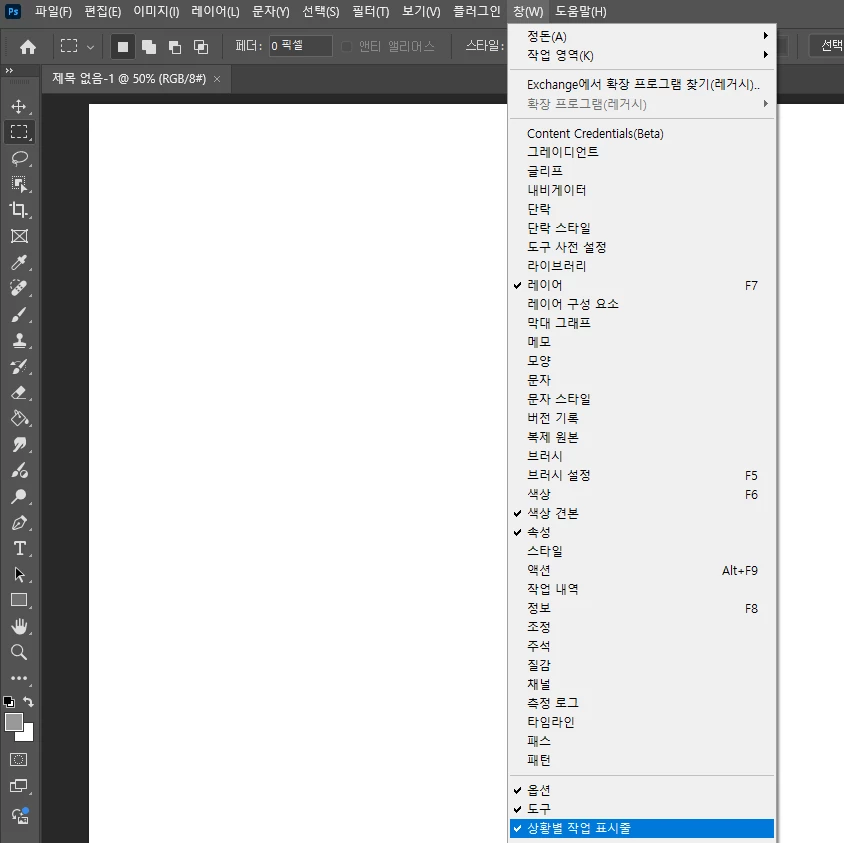 만약 [ Generative Fill ] 이 노출되는 바가 안 보이시는 것이라면 < 상황별 작업 표시줄 > 을 활성화 해볼 수 있습니다. 아래 사진을 참고해서 메뉴를 찾아보시겠어요?
