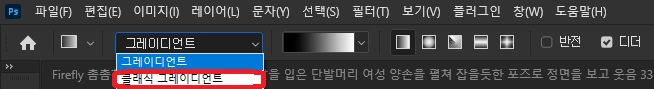 2.  옵션 설정 바의 그레이디언트를 클릭 > 클래식 그레디언트로 변경해주세요