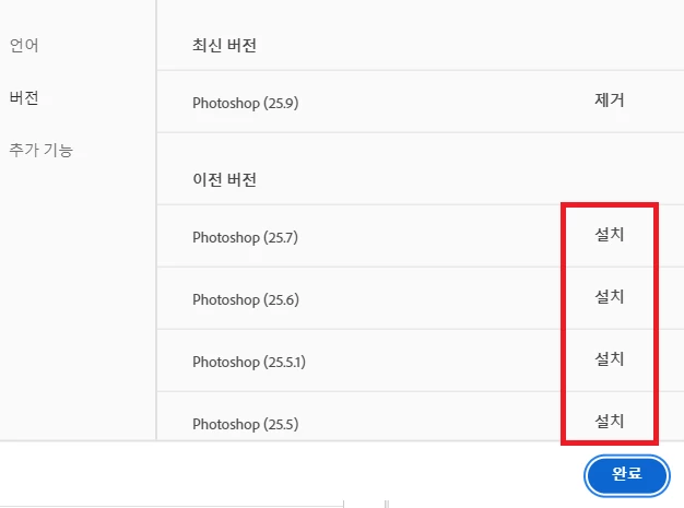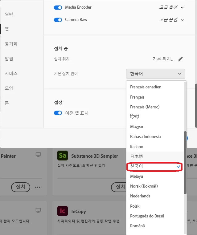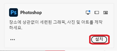 3. 앱 > 포토샵 > 설치를 클릭하여 언어팩을 설치해줍니다.