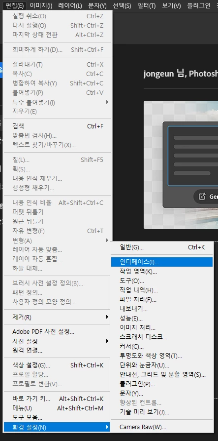 4. 설치가 완료되면 포토샵을 실행 > 편집 > 환경설정 > 인터페이스를 클릭해주세요.