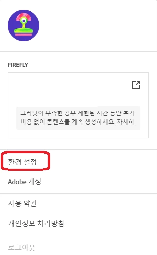 1. Creative Cloud Desktop App을 실행 >우측 상단의 원모양(계정)클릭 > 환경설정을 클릭 합니다.