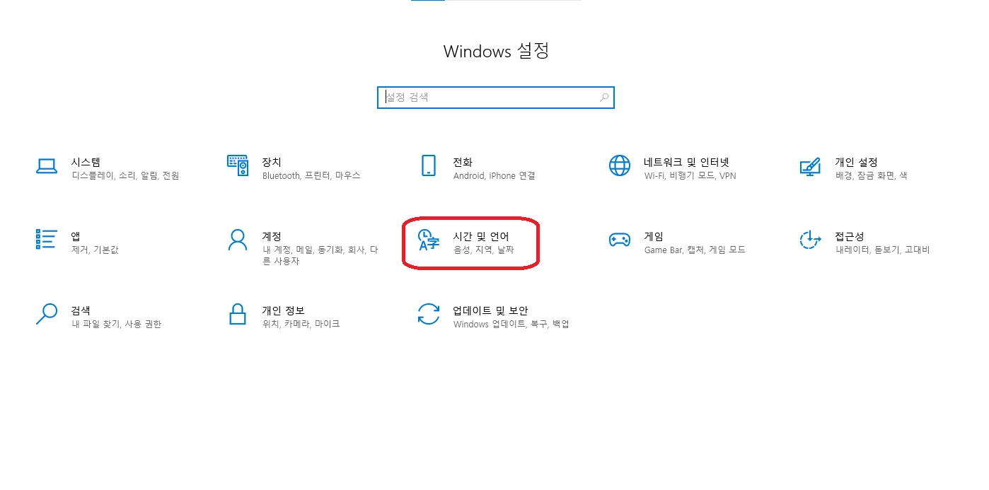(1). 윈도우 설정 > 시간 및 언어를 클릭합니다.