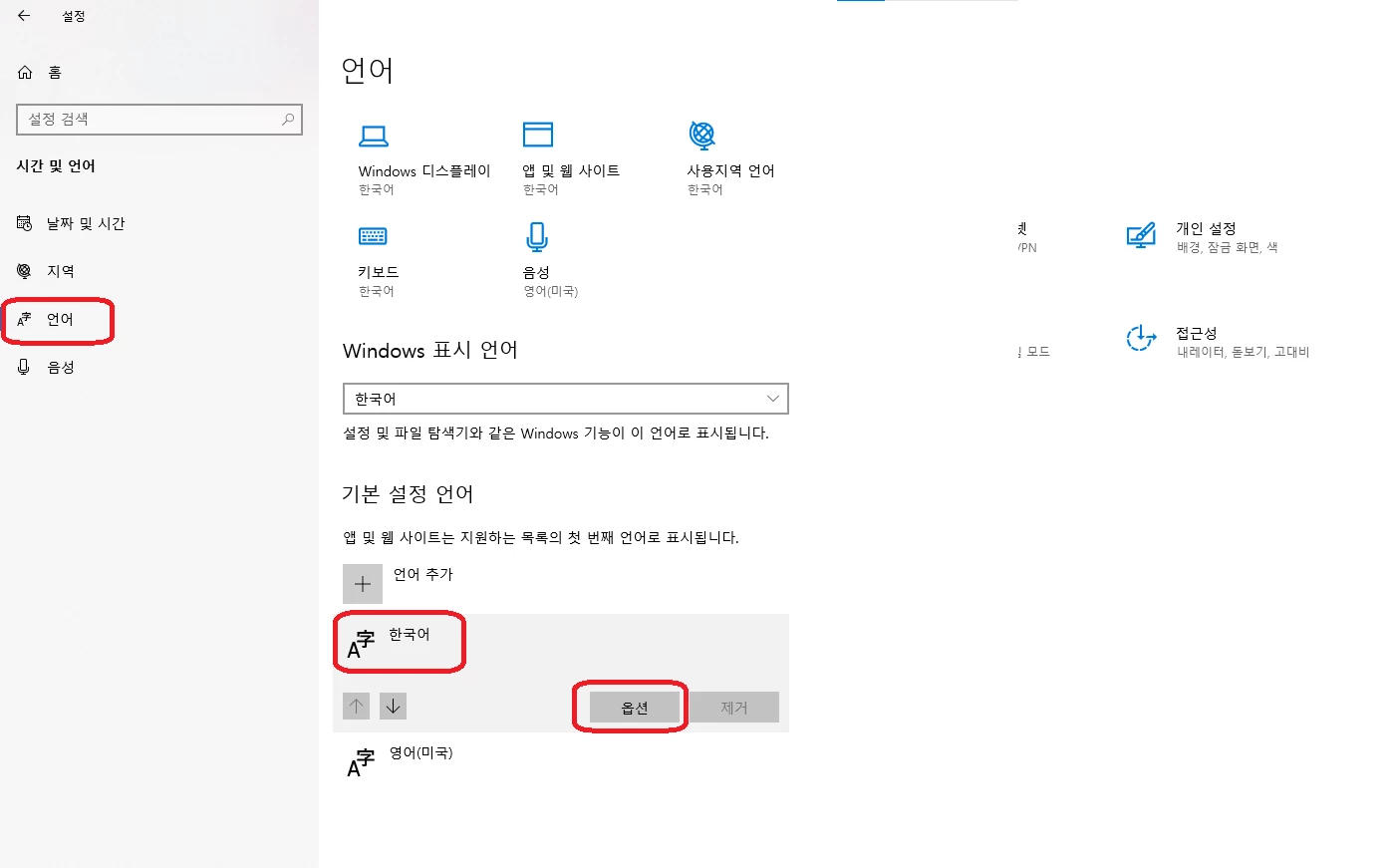 (2). 언어 > 한국어 > 옵션을 클릭합니다.