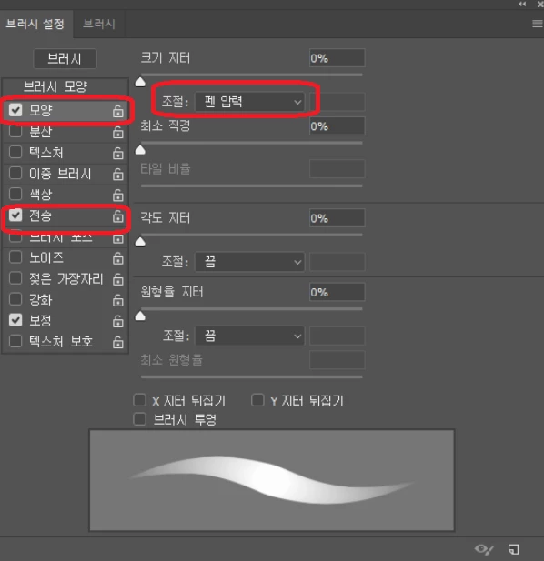 (3) 전송에 체크 후 조절 > 펜 압력으로 변경합니다.