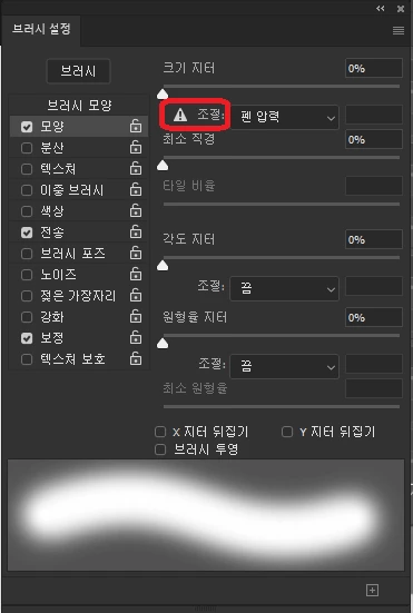 (2) 모양에 체크 후 조절 > 펜 압력으로 변경합니다.