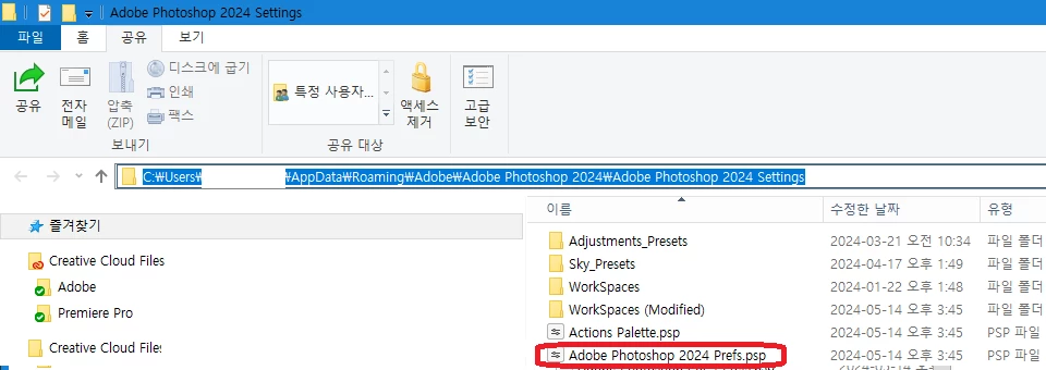 ⑤ 설정폴더 내 Adobe Photoshop 2023 Prefs.psp 파일 이름을 Adobe Photoshop 2024 Prefs.psp으로 변경 합니다.