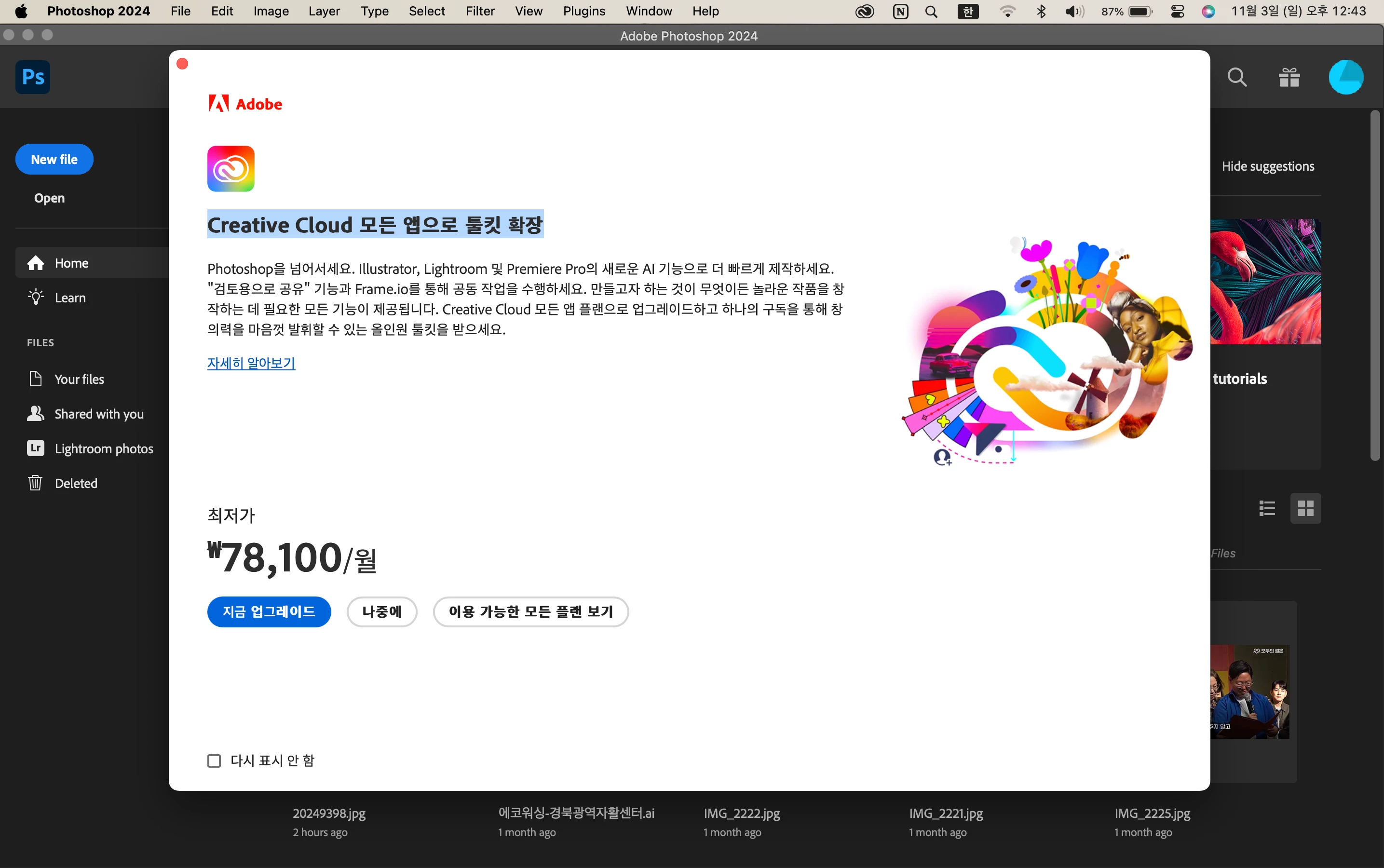 크리에이티브 클라우드에서 환경설정으로 프로모션 체크 해제도 하였고, 팝업이 뜰때마다 '다시 표시 안함'에 체크하고 나중에를 클릭하거나, X를 클릭하여 창을 종료해도 계속 뜨네요. 해결 부탁 드립니다.