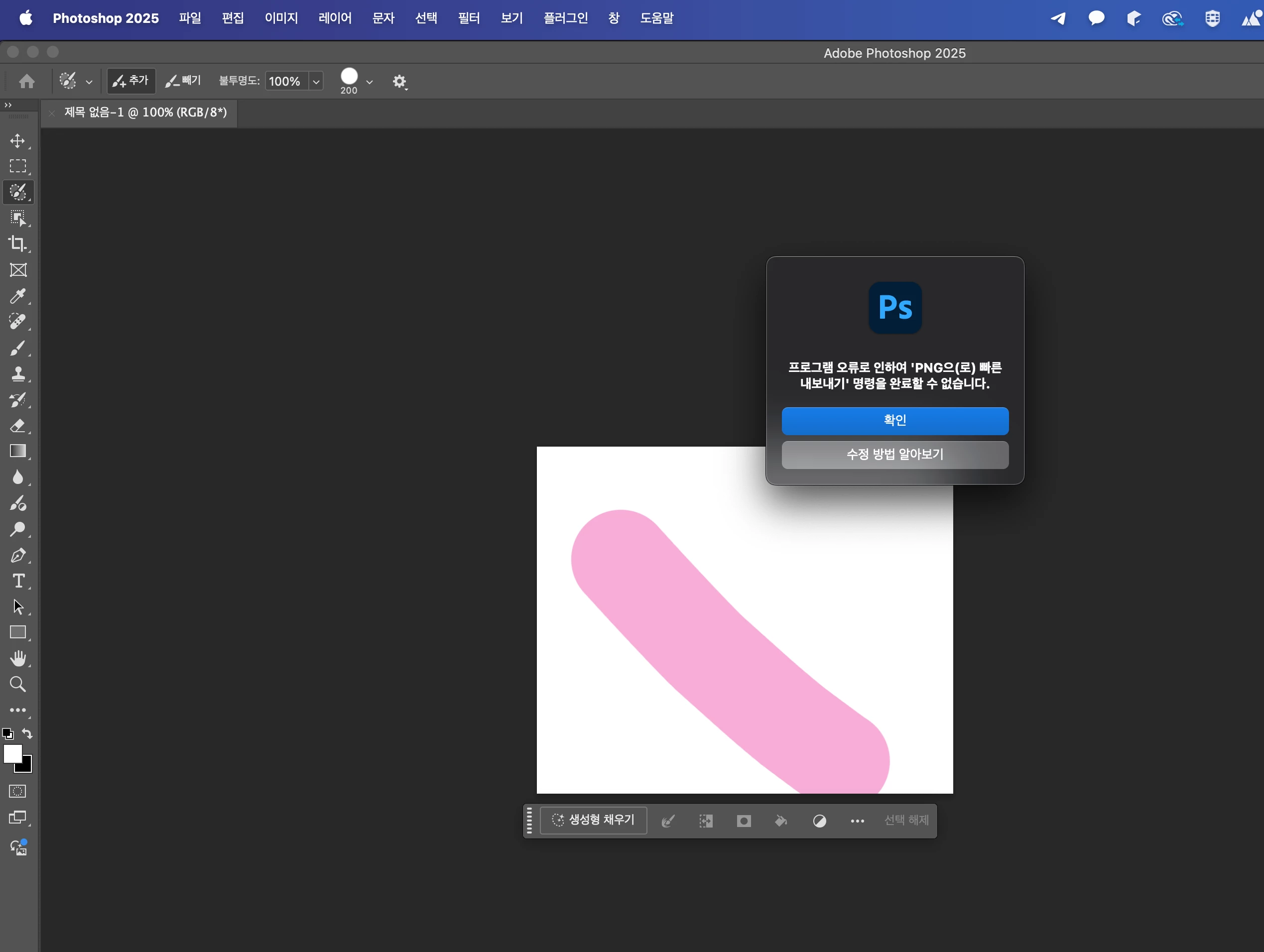 Photoshop 2025 26.0.0 설치 후에 내보내기시에 위에처럼 계속 오류가 발생하고 있습니다.