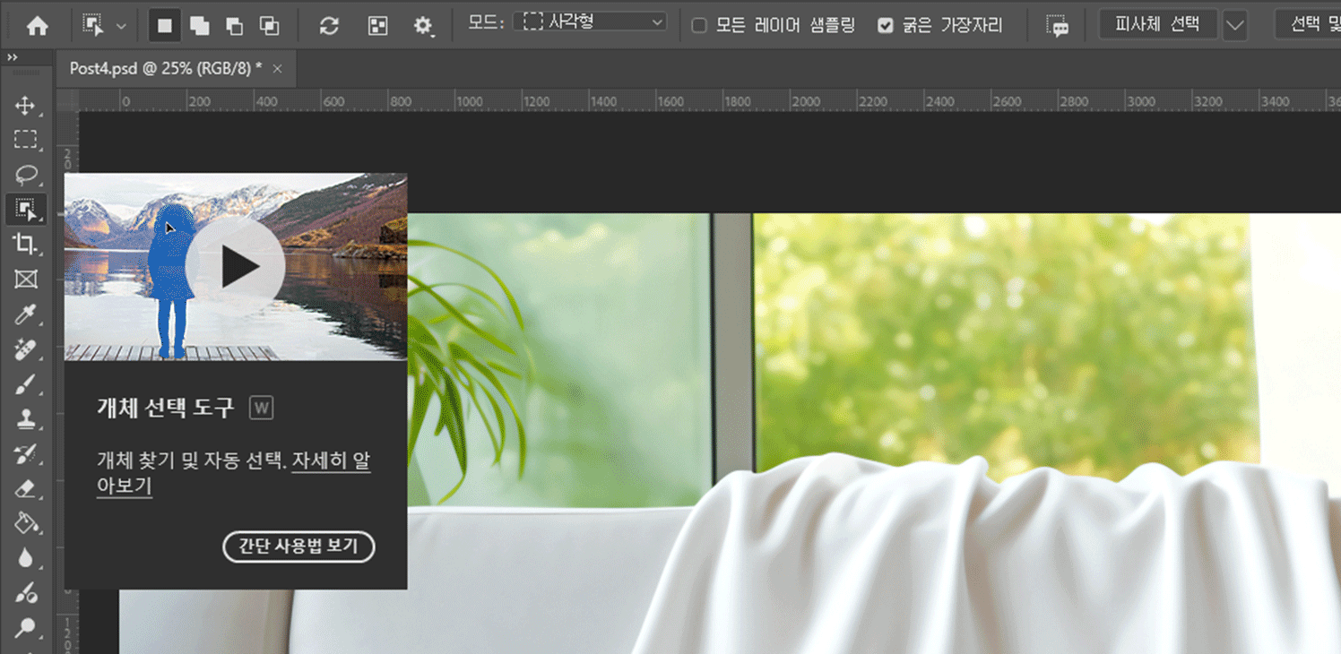 도구 툴 중에서도 개체 선택 도구 [ W ] 를 누른 뒤, 오늘의 목표인 흰 담요를 클릭하여 선택하겠습니다!