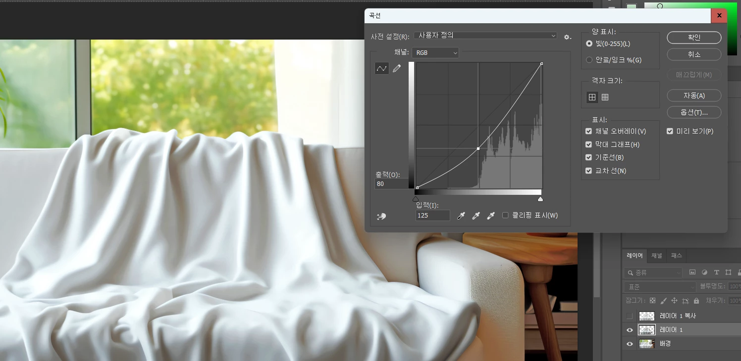 [ 곡선 ] 메뉴를 통해 담요의 어두운 부분을 더욱 어둡게 보정합니다!
