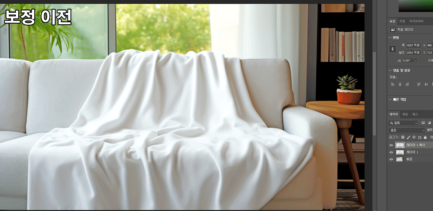 보정 전과 후의 차이가 느껴지실까요? 담요의 색에 주의해주세요!