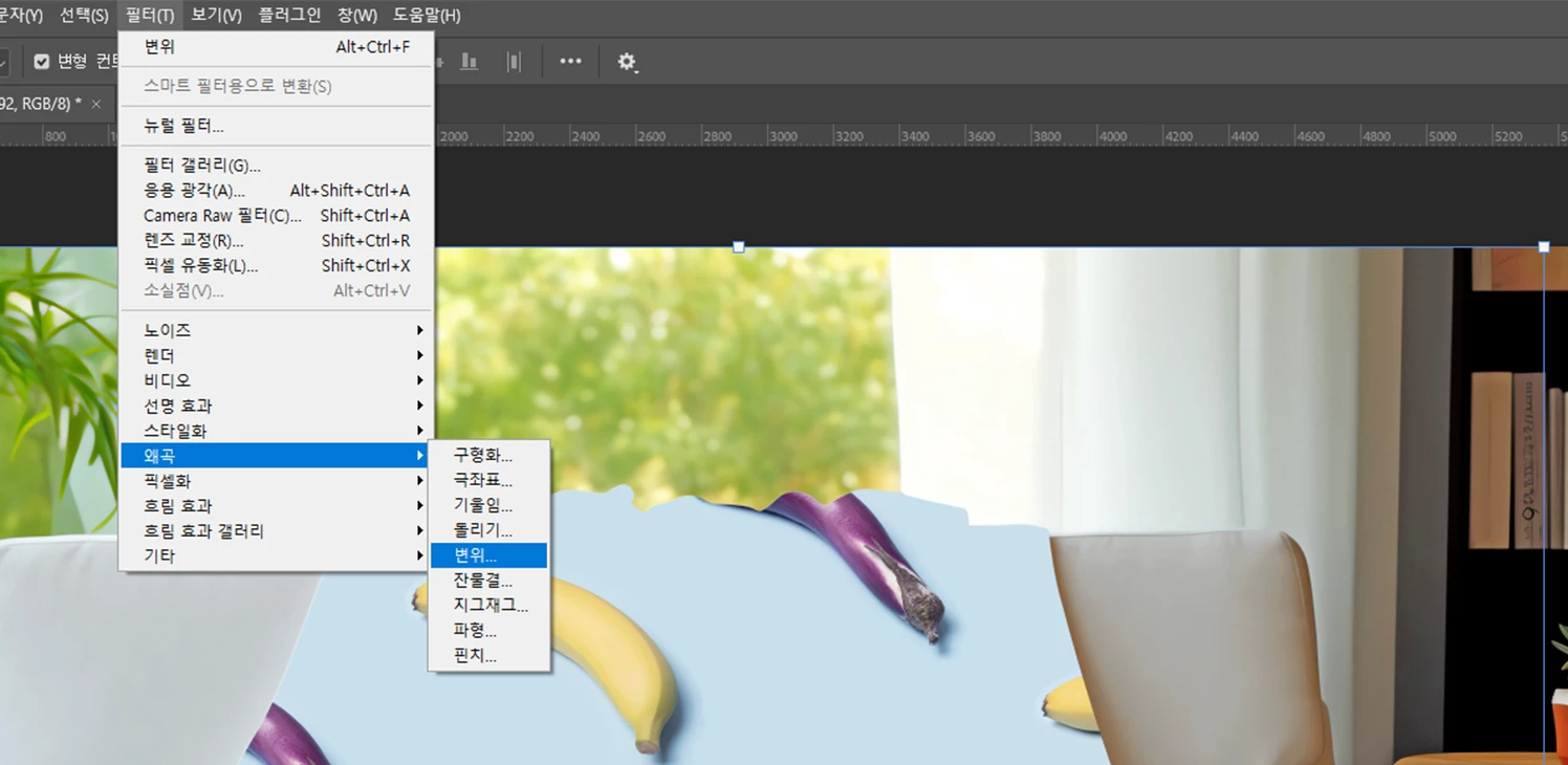 패턴 레이어를 선택한 채로, [ 필터 ] > [ 왜곡 ] > [ 변위 ] 기능을 실행해주세요!