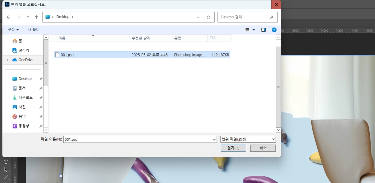2단계 과정에서 만들었던 베이스 파일 ( 담당자의 경우, 001.PSD ) 을 불러옵니다!