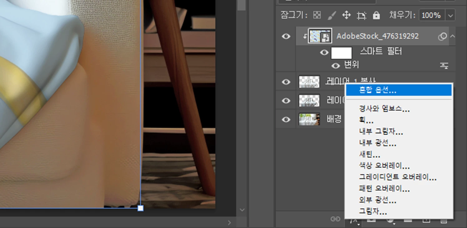 이후, 레이어 모드 ( 레이어 하단 fx 아이콘 ) 를 선택하여 [ 혼합 옵션 ] 을 실행해주세요!