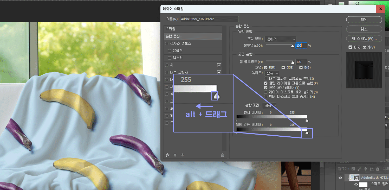 실행된 혼합 옵션 창에서 [ 혼합 조건 : 밑에 있는 레이어 ] 항목의 우측 화살표가 보이실텐데요!
