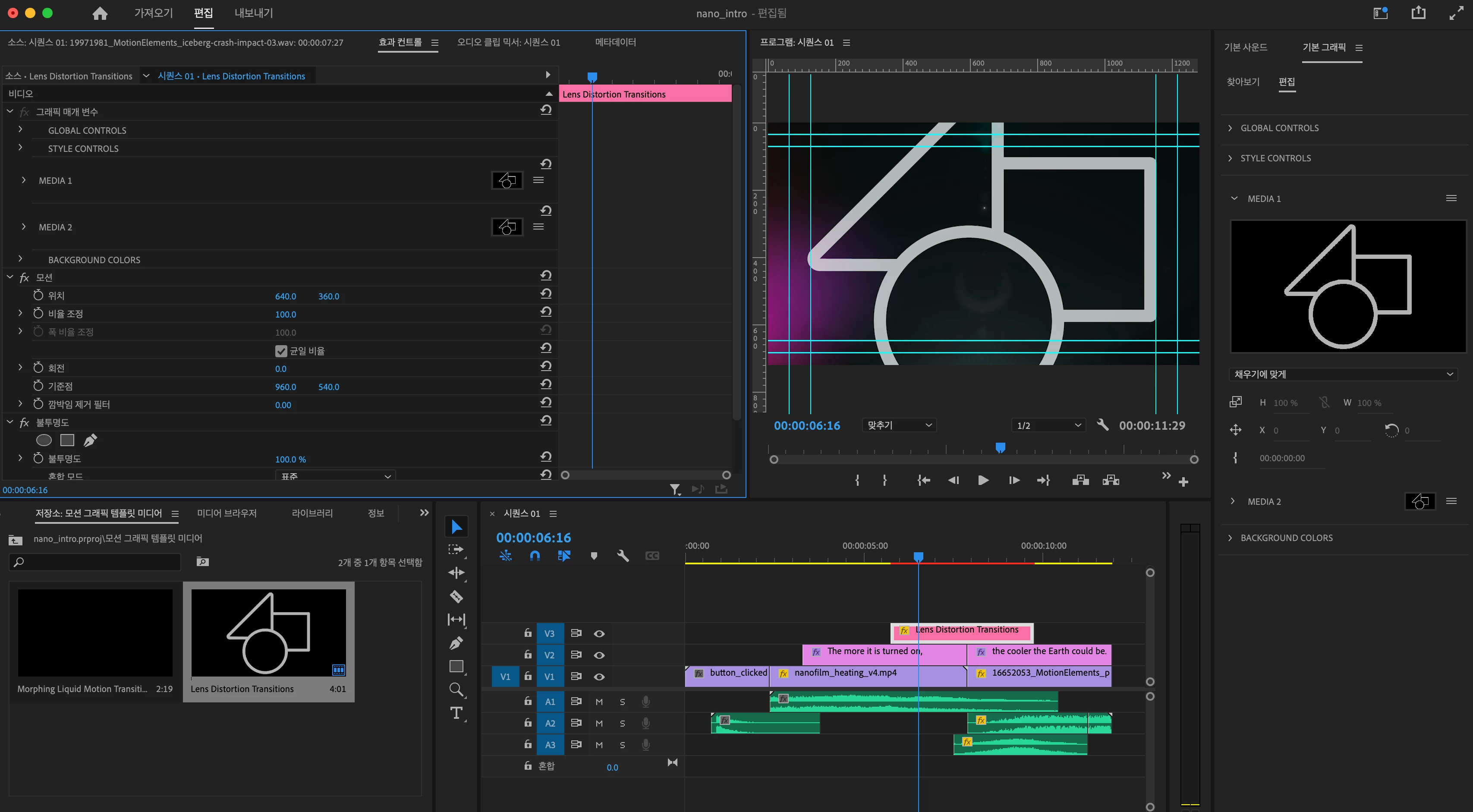 기본 그래픽에 존재하는 lens distortion transition 사용 방법, MEDIA1, MEDIA2 할당 방법은?
