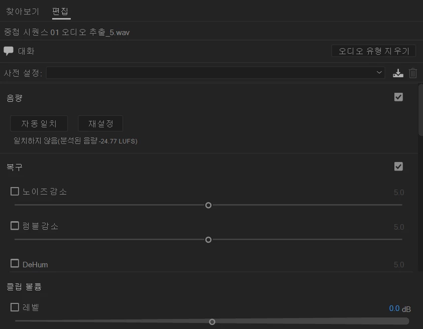 첨부 사진에서와 같이 기본 사운드 오디오 유형 '대화'칸에서 사전 설정이 아예 사라져버렸습니다.