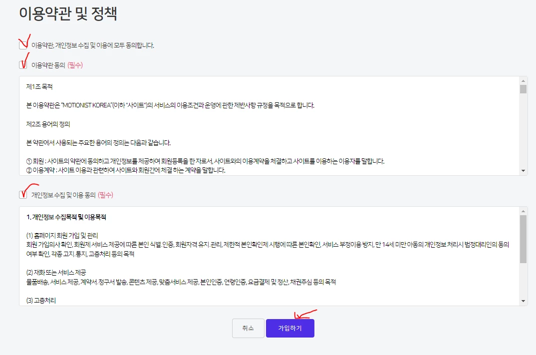 모두 동의해주신뒤, 가입하기 버튼을 눌러줄게요!