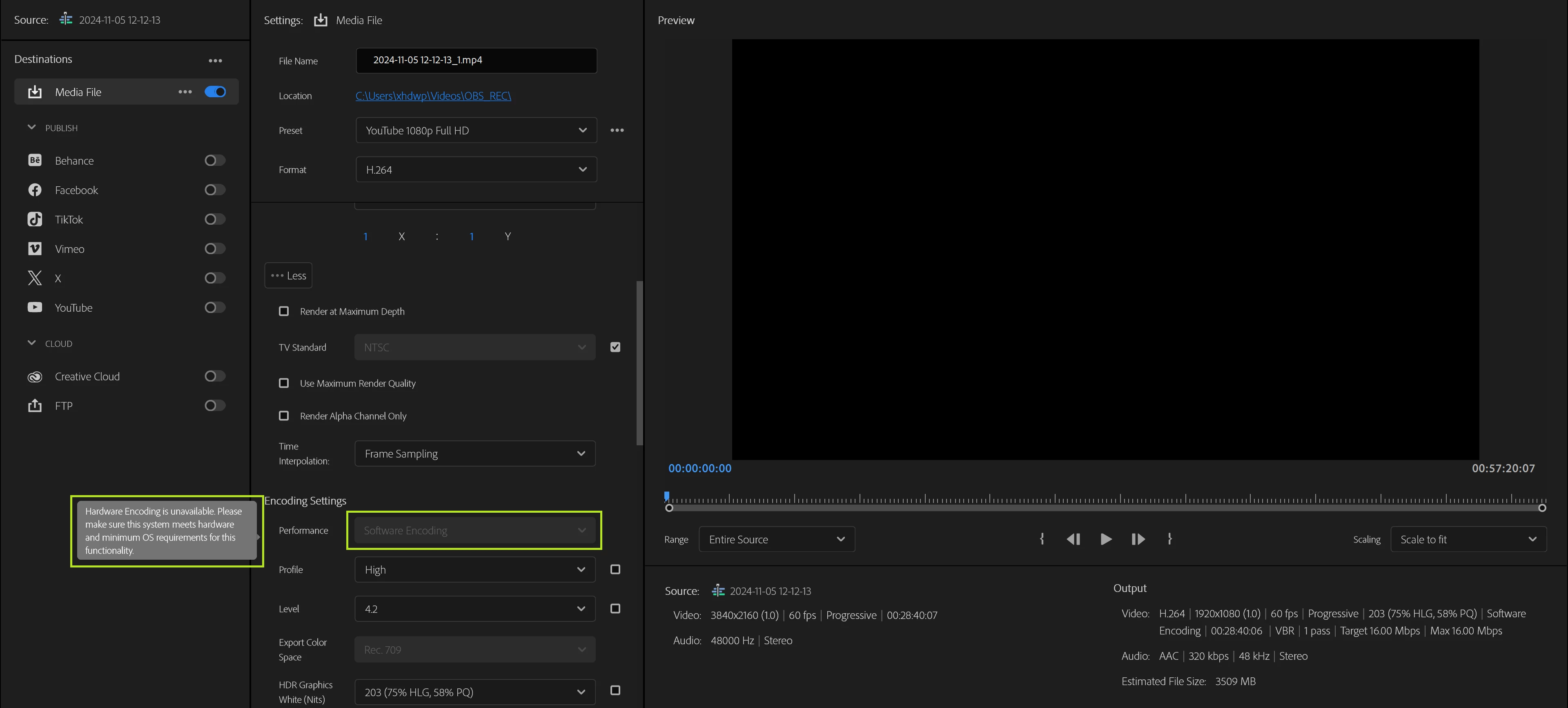 내보내기 설정에서 하드웨어 인코딩을 사용할 수 없습니다.