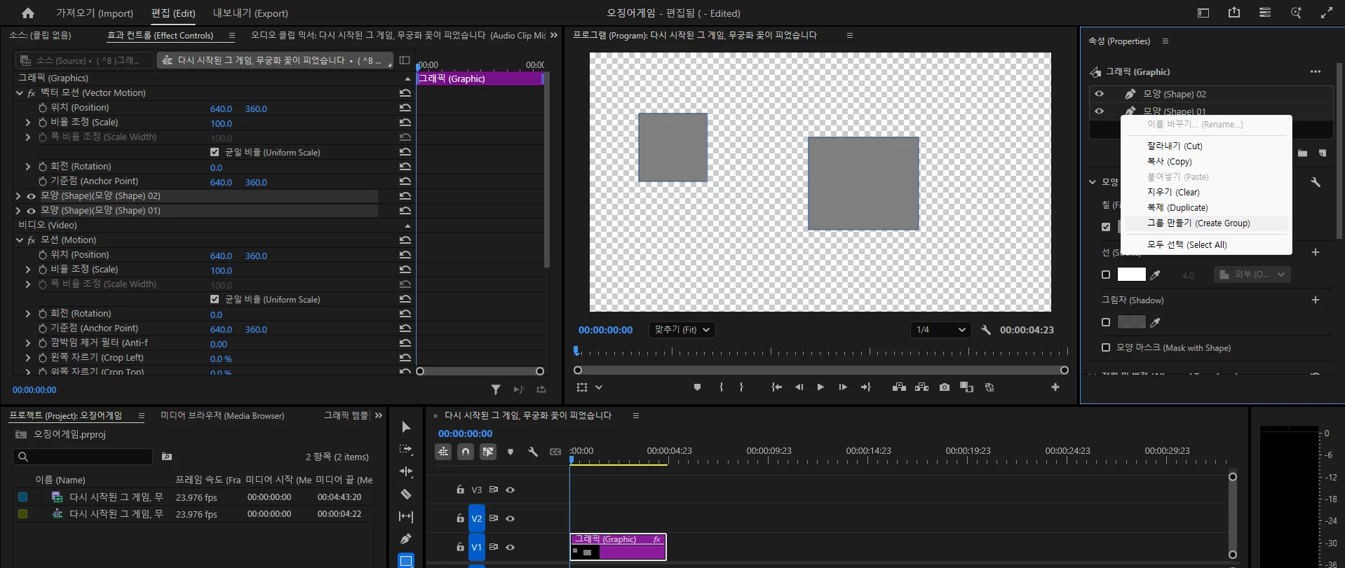 도형을 클립 두개에 각각 따로 따로 그래픽을 만든뒤 두클립을 잡고 중첩 시퀀스를 진행하거나 '그룹'을 눌러 그룹화 할 수 있겠네요.
