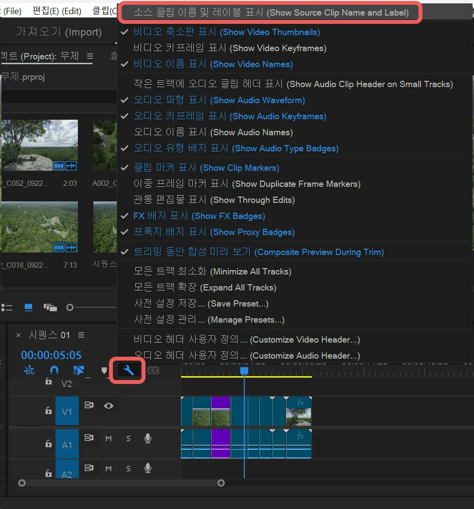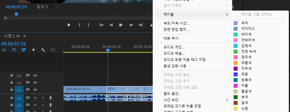 렌치 아이콘을 눌러 맨 위 메뉴를 비활성화하면 클립별로 레이블 색상을 다르게 지정할 수 있습니다.